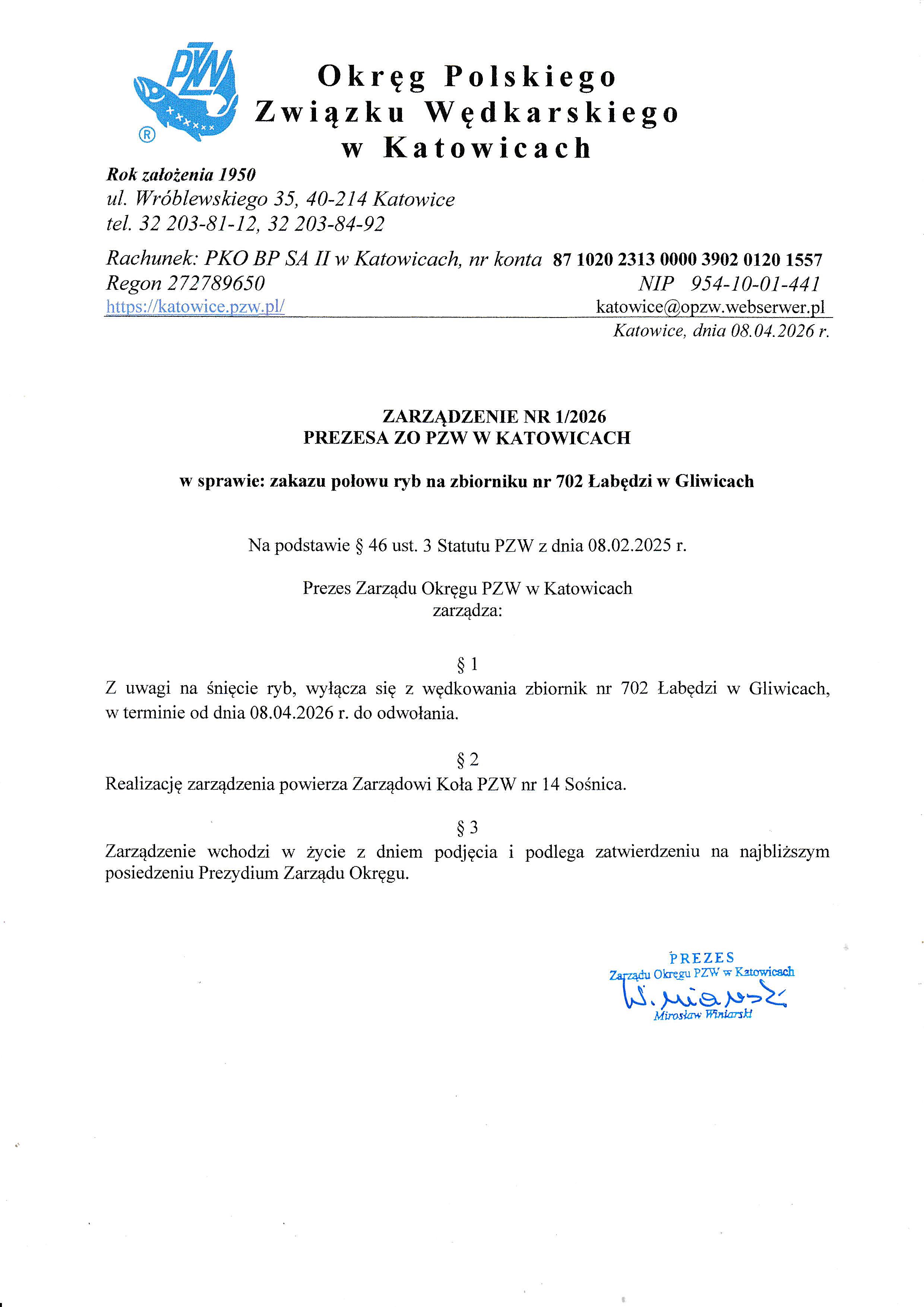 Zakaz połowu ryb na zbiorniku nr 702 Łabędzi w Gliwicach