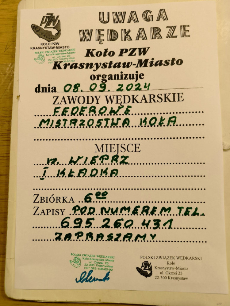 Zawody Spławikowe o Mistrzostwo Koła PZW Żółkiewka dnia 26 kwietnia 2026 r.